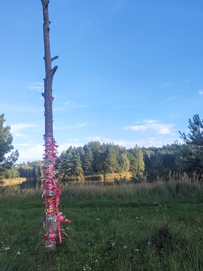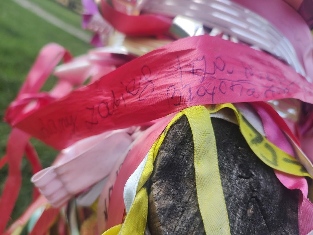 Na pniu, który został po drzewie, ludzie zawiązali setki kolorowych wstążek.
