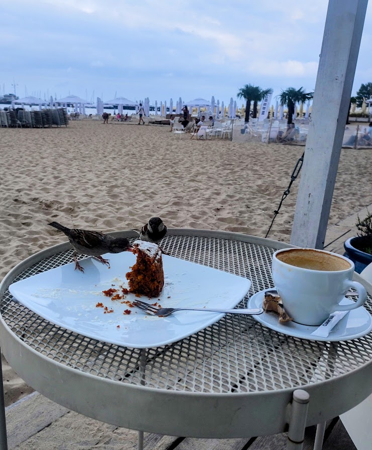 Siedziałam przy stoliku na plaży. Cisza, filiżanka kawy, talerz z ciastem i odrobina oddechu – ten moment, kiedy wszystko cichnie i świat zostaje na chwilę na zewnątrz.