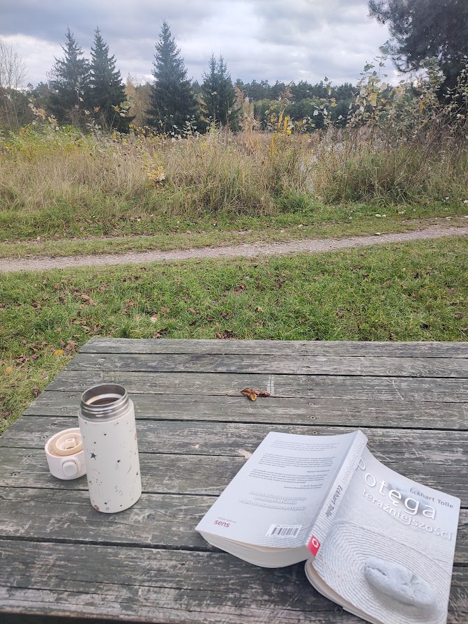 Usiadłam na ławce. Ciepło kubka przenikało przez palce, a słowa z książki współbrzmiały z ciszą lasu. Herbata parowała jak oddech ziemi. To był mój mały rytuał obecności.