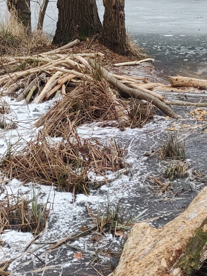 Najbardziej zatrzymało mnie domostwo bobrów. Zaplecze ich pracy wyglądało jak mały tartak — drewno przygotowane, obrobione, gotowe do użycia. Sam dom był solidny, przemyślany, z dostępem do wody nawet pod lodem. Bez zbędnych elementów. Funkcja, trwałość, sens.